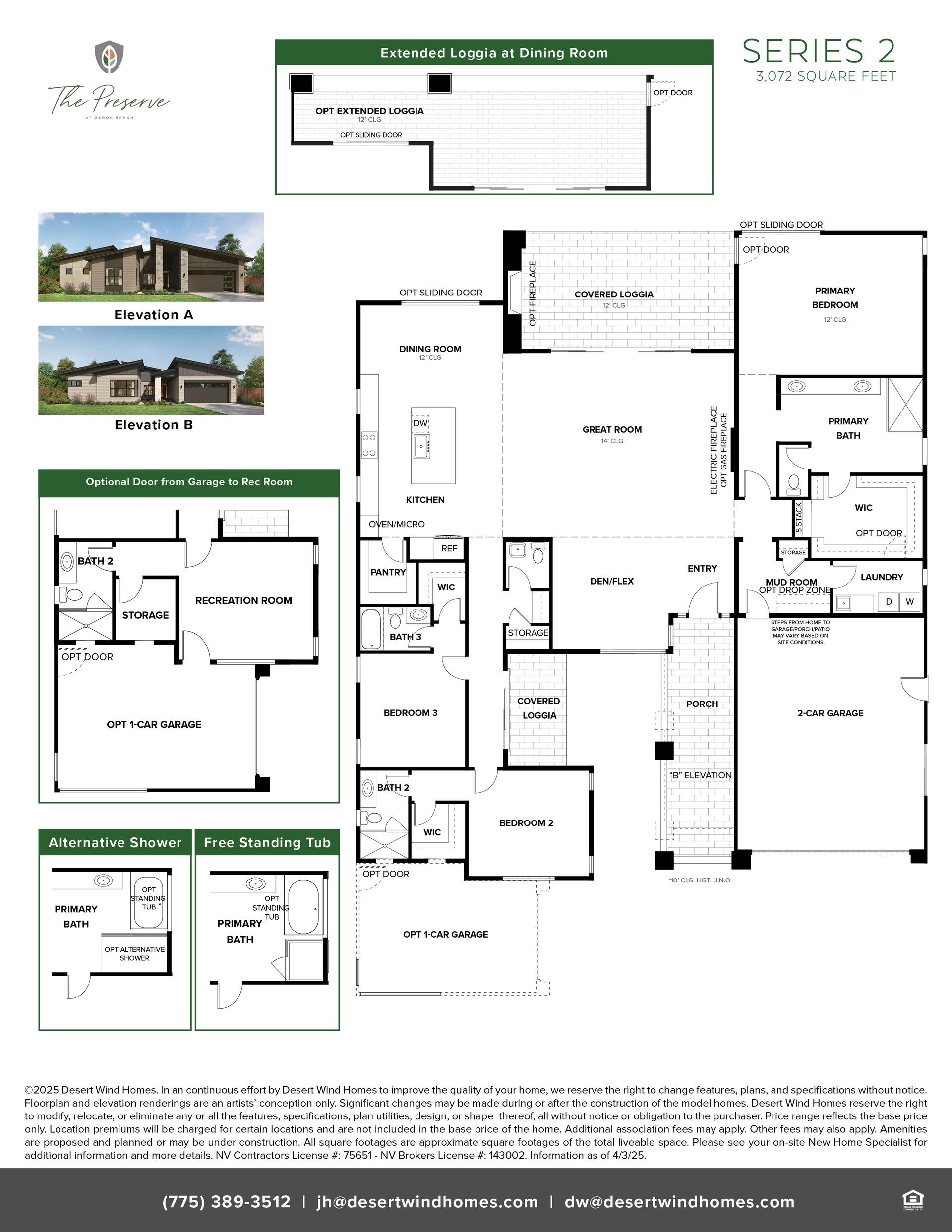 One-story single-family home featuring 3,072 square feet, 3 bedrooms, den/flex space, 3.5 bathrooms, and a 2-car garage. Options include 4th bedroom or office ILO den/flex space, multi-gen suite, or 1-car garage.