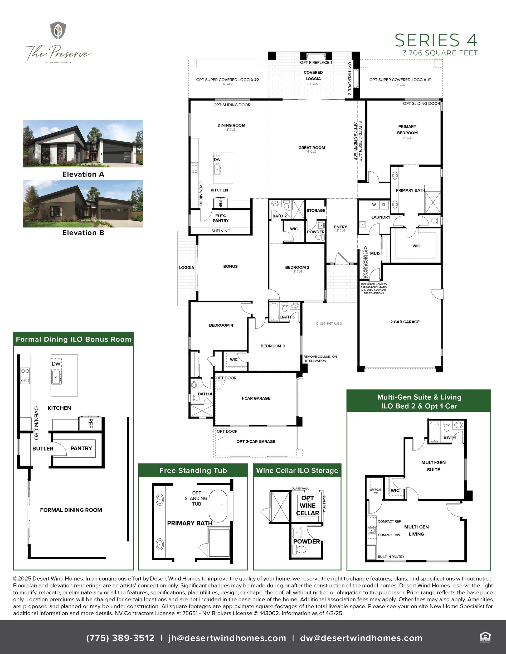 One-story single-family home featuring 3,706 square feet, 4 bedrooms, 4.5 bathrooms, and a 3-car garage. Options include a wine cellar, formal dining, multi-gen suite, and second 2-car garage.