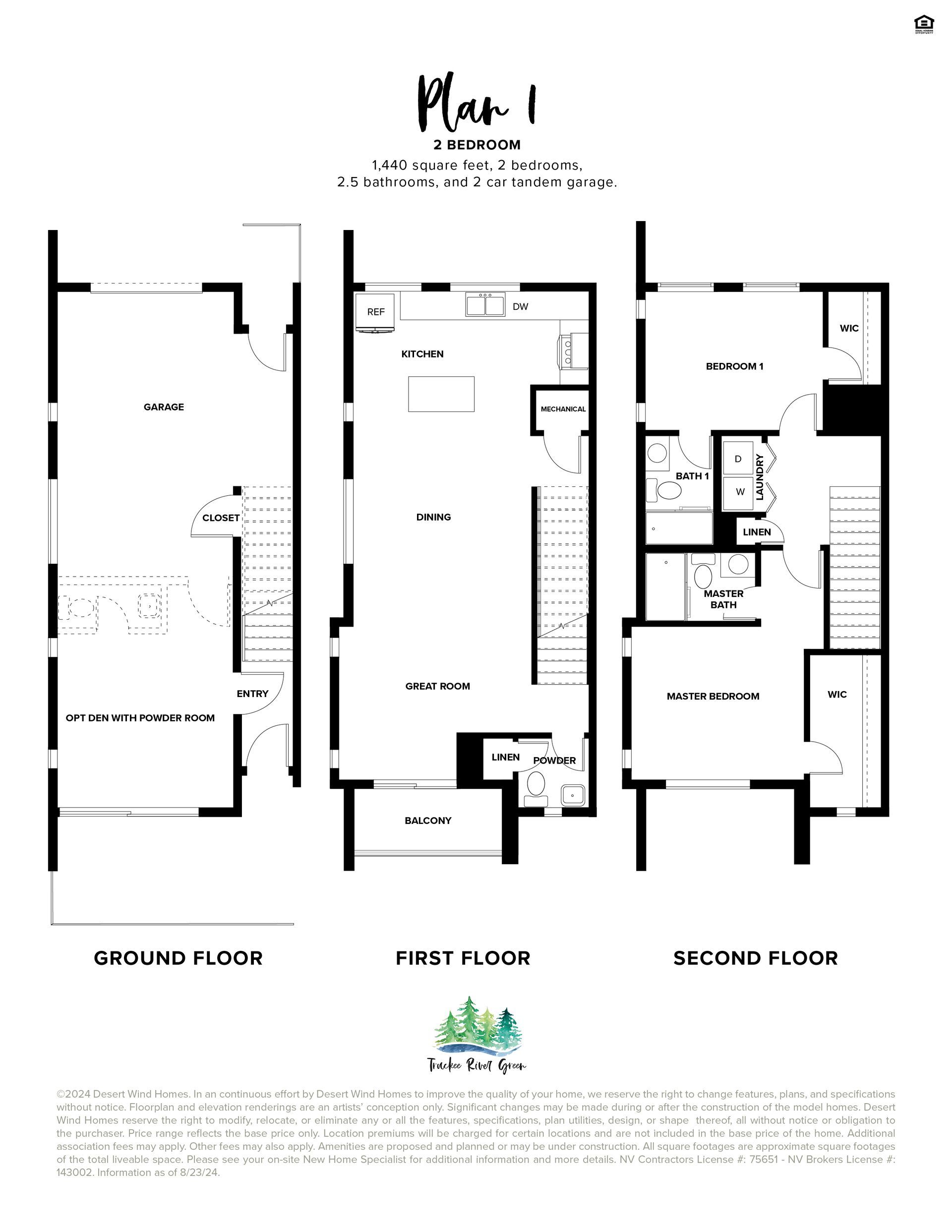 Three-story town home with 1,639 square feet, 2 bedrooms + den, 2 full + 2 half bathrooms, and 1 car tandem garage.